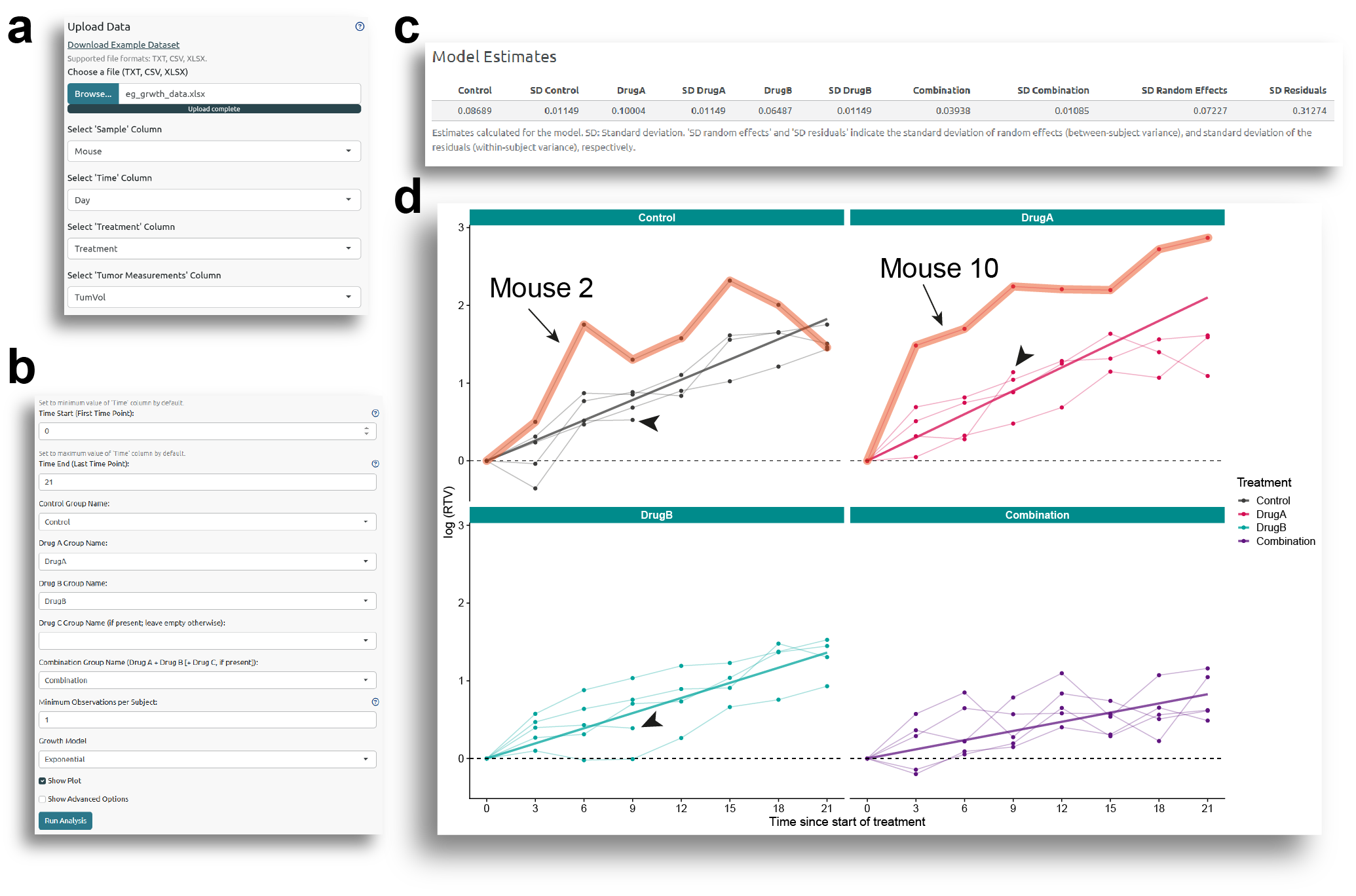 Once the data is uploaded, the user will need to specify which columns contain each information. For this example, columns Mouse, Day, Group, and TumVol contain the information about the sample IDs, time points, treatments, and tumor measurements, respectively (Fig. 1a).