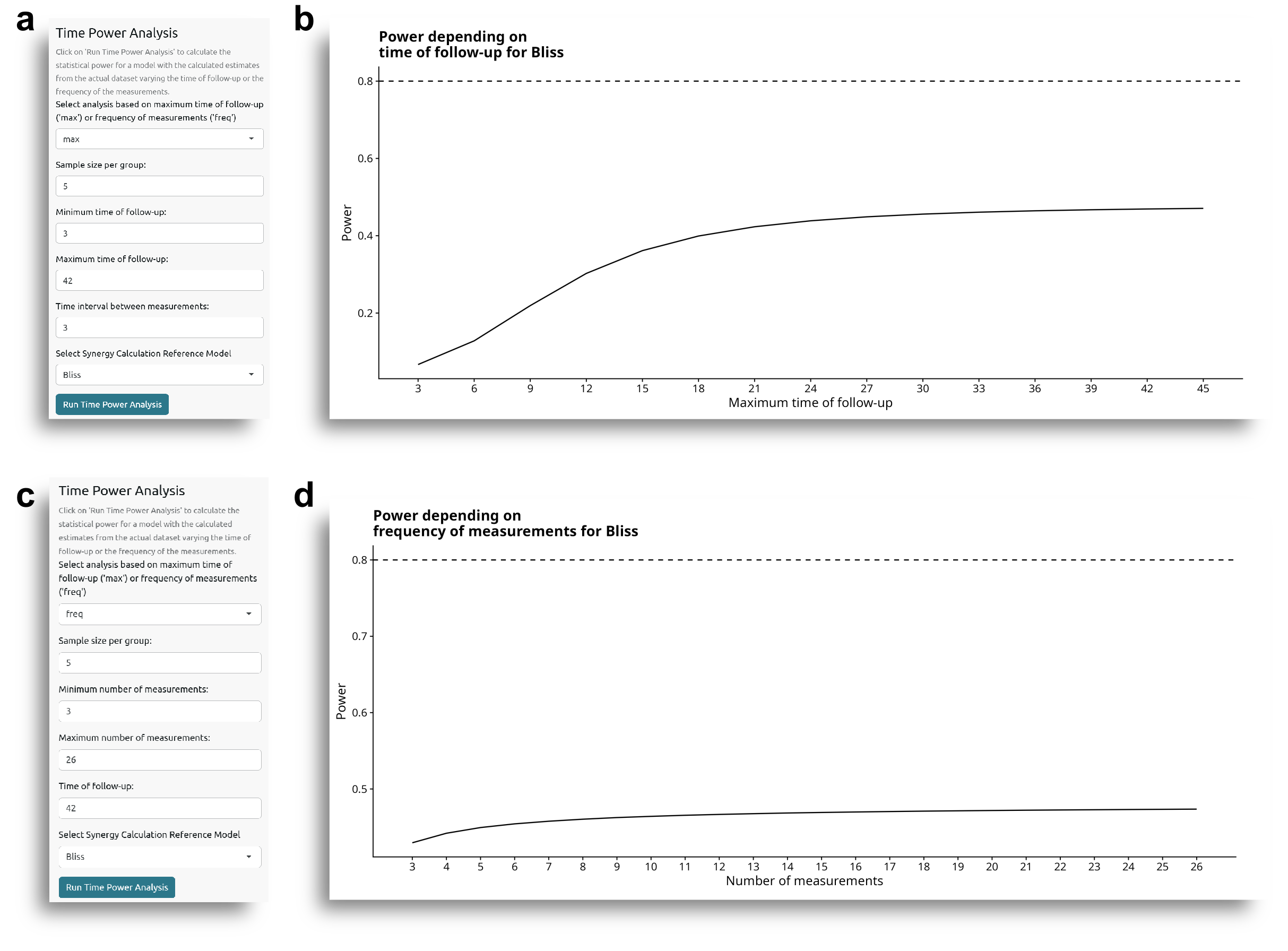 SynergyLMM then provides the a priori power calculation for each exemplary dataset defined by a specific set of experimental parameters.
