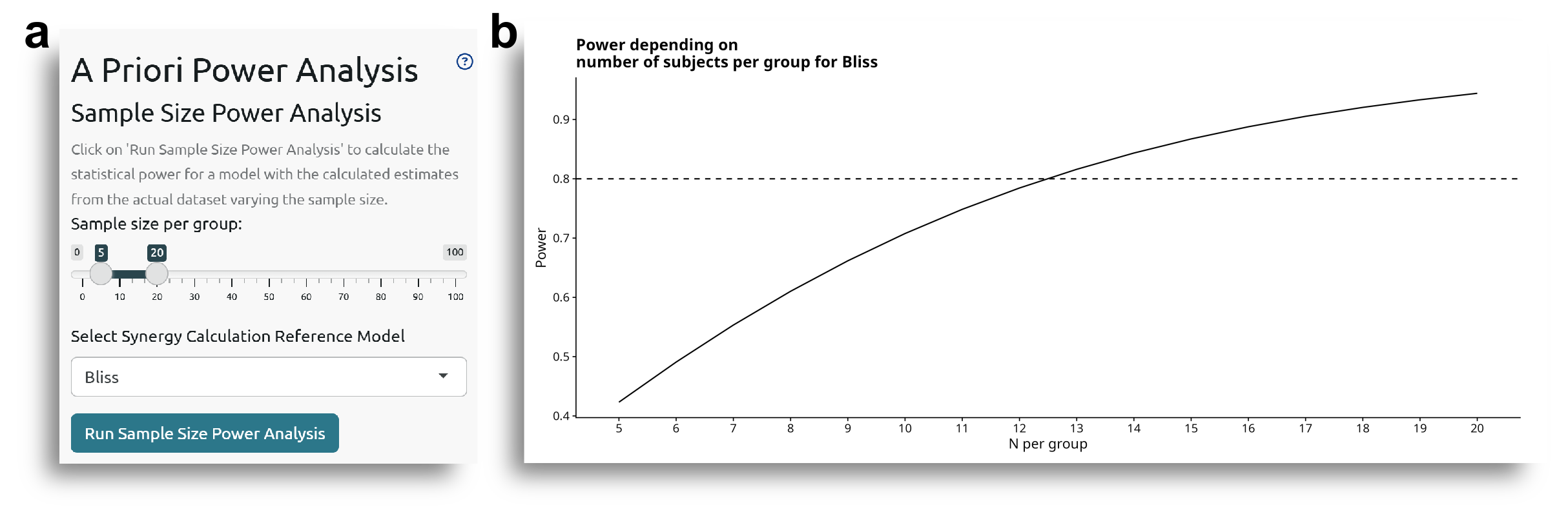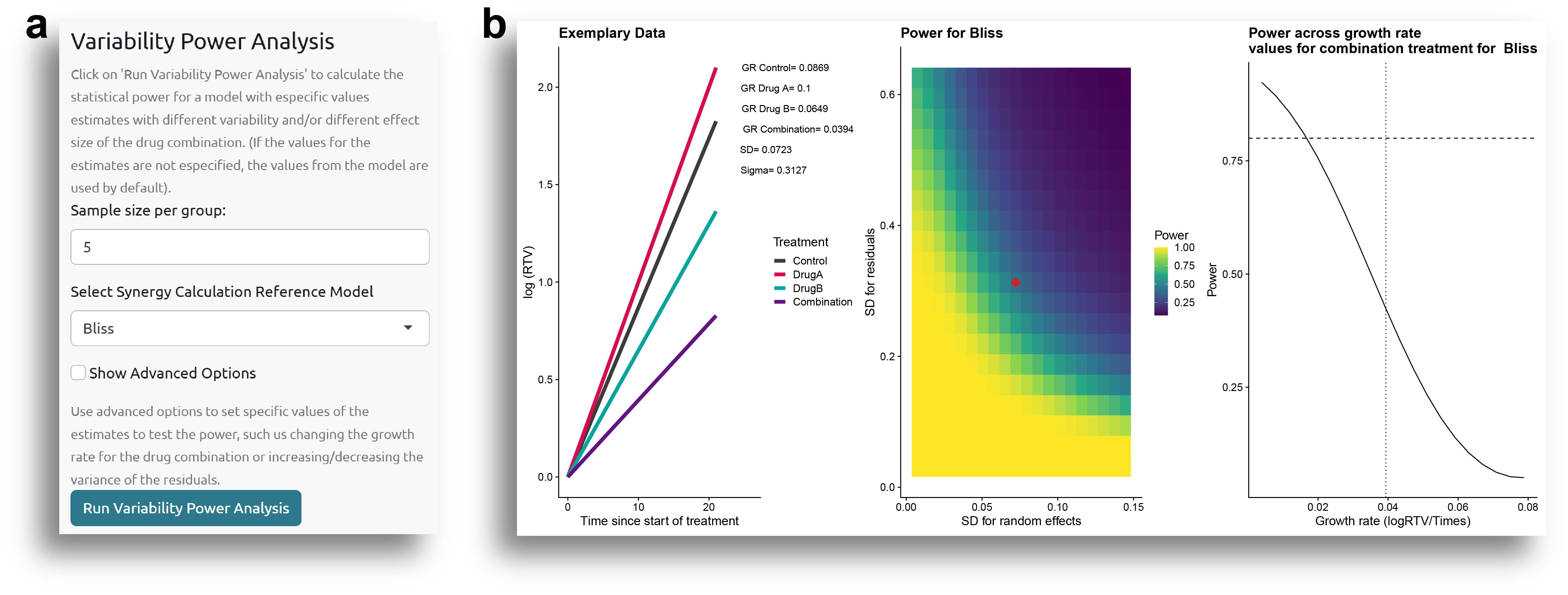 The user can test how statistical power varies by modifying the variability and the drug combination effects in the 'Variability Power Analysis' side panel (Fig. 11a).