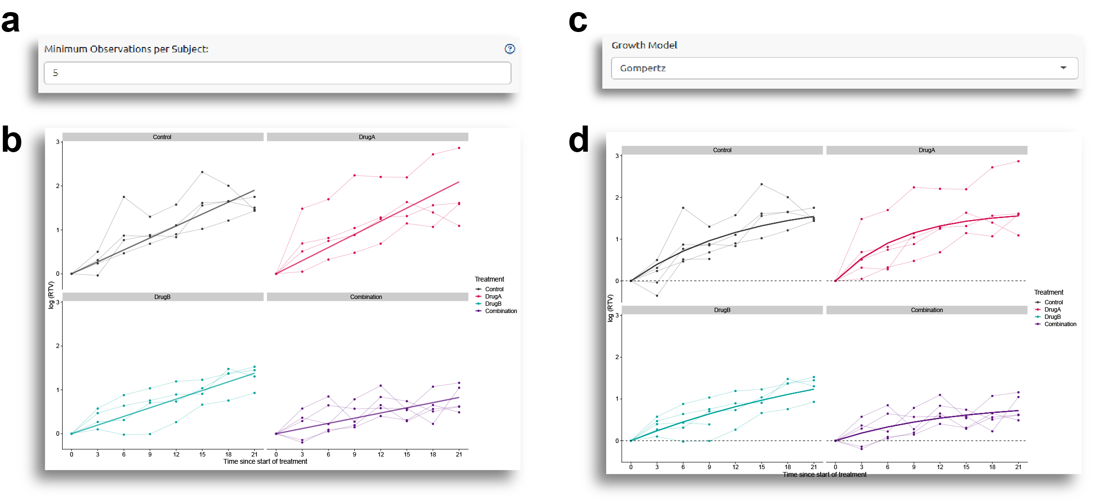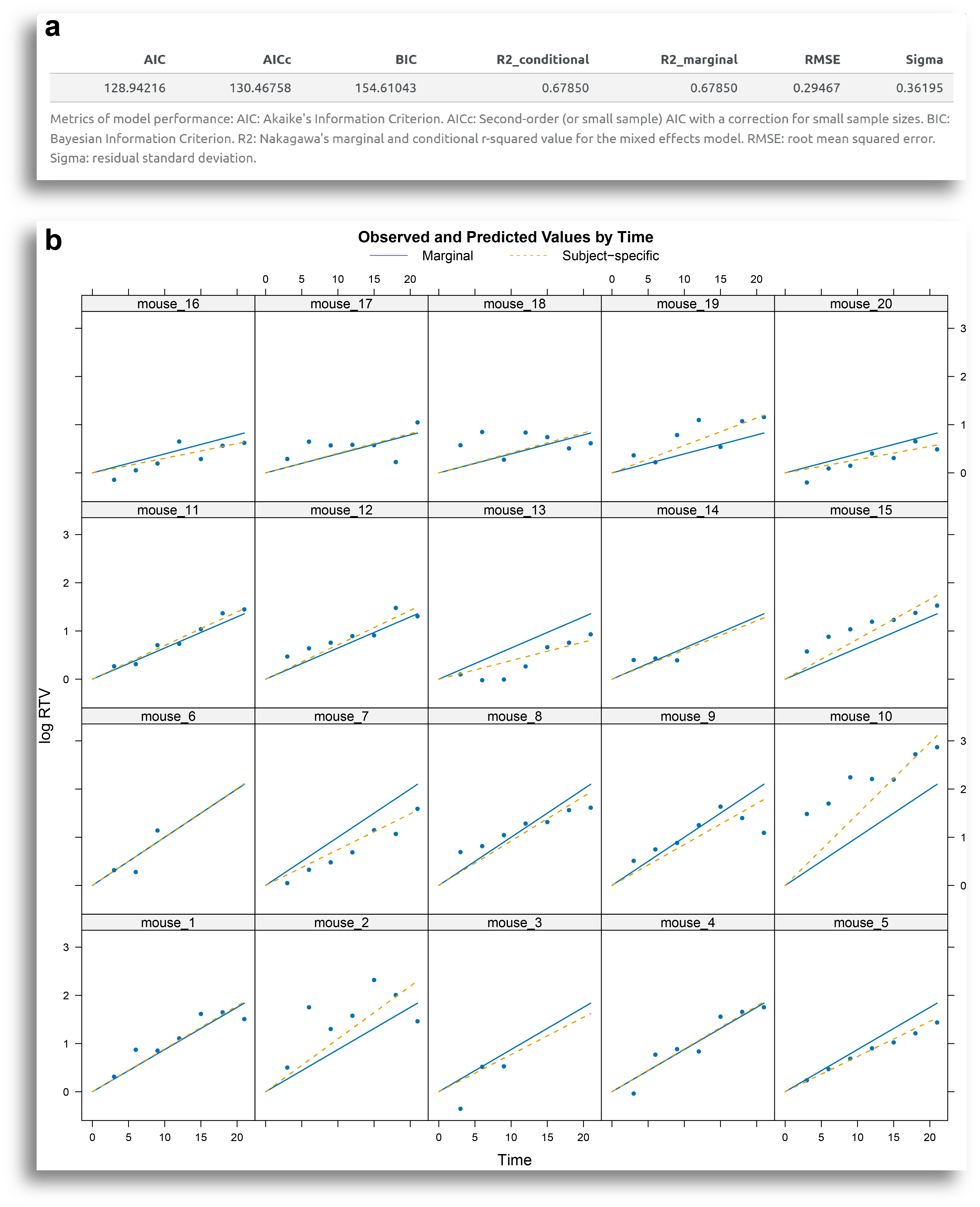 Next, clicking on 'Run Analysis' will fit the model and produce a table with the model estimates, (Fig. 1c), including the tumor growth rates of the different groups, and the standard deviations for the random effects and for the residuals. If 'Show Plot' is selected, the plots with the tumor growth curves are displayed along with the regression line for the fixed effect coefficients (i.e., the tumor growth rates for the control and treatment groups, Fig. 1d).