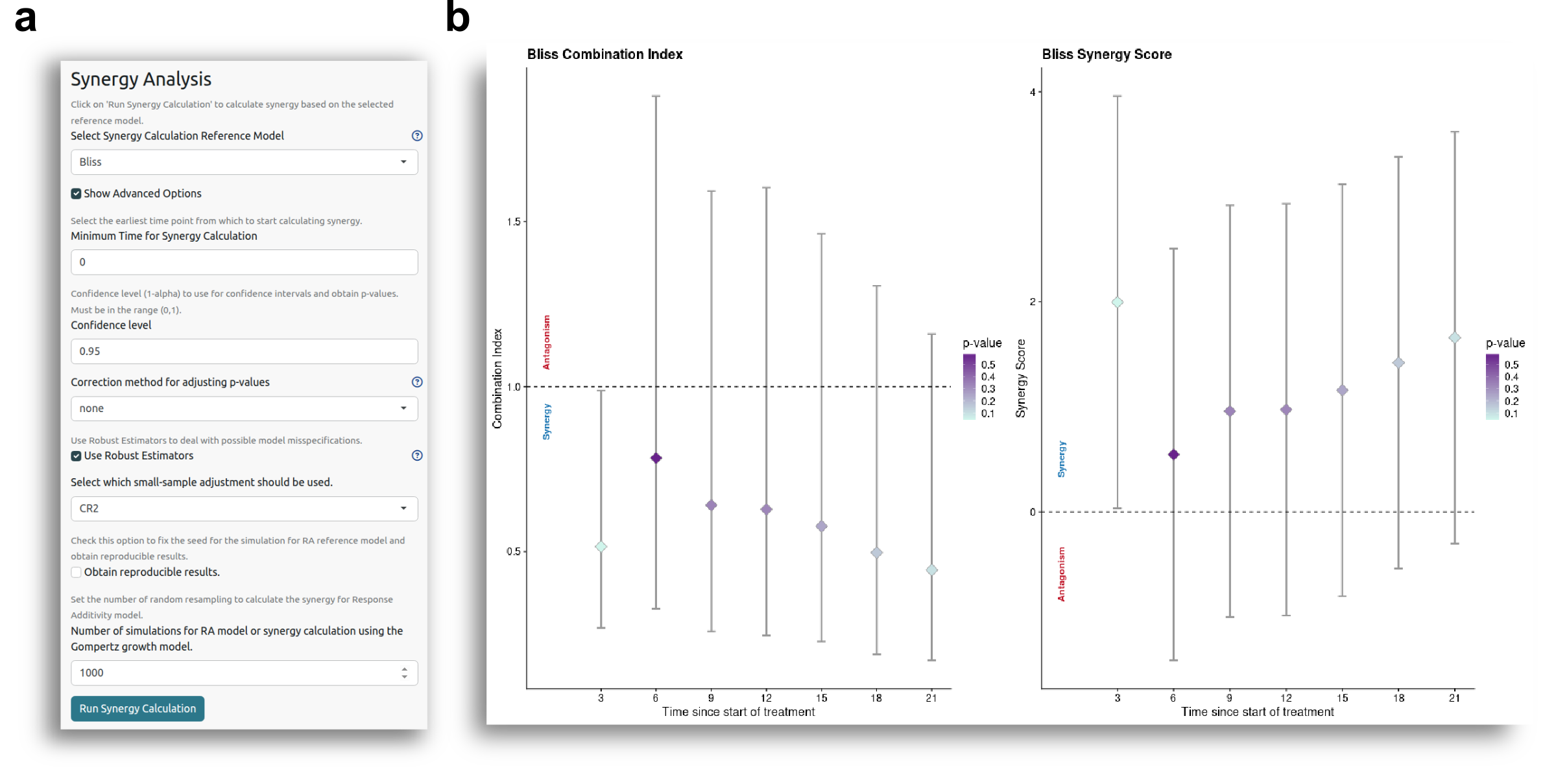 Once the model is fitted, the Synergy Analysis can be performed. Fig. 3a shows the different options for synergy analysis. The user can choose between Bliss, highest single agent (HSA), or response additivity (RA) reference models. In the advance options, selecting 'Use Robust Estimators' will apply sandwich-based cluster-robust variance estimators. This is recommended and can help to deal with possible model misspecifications.
