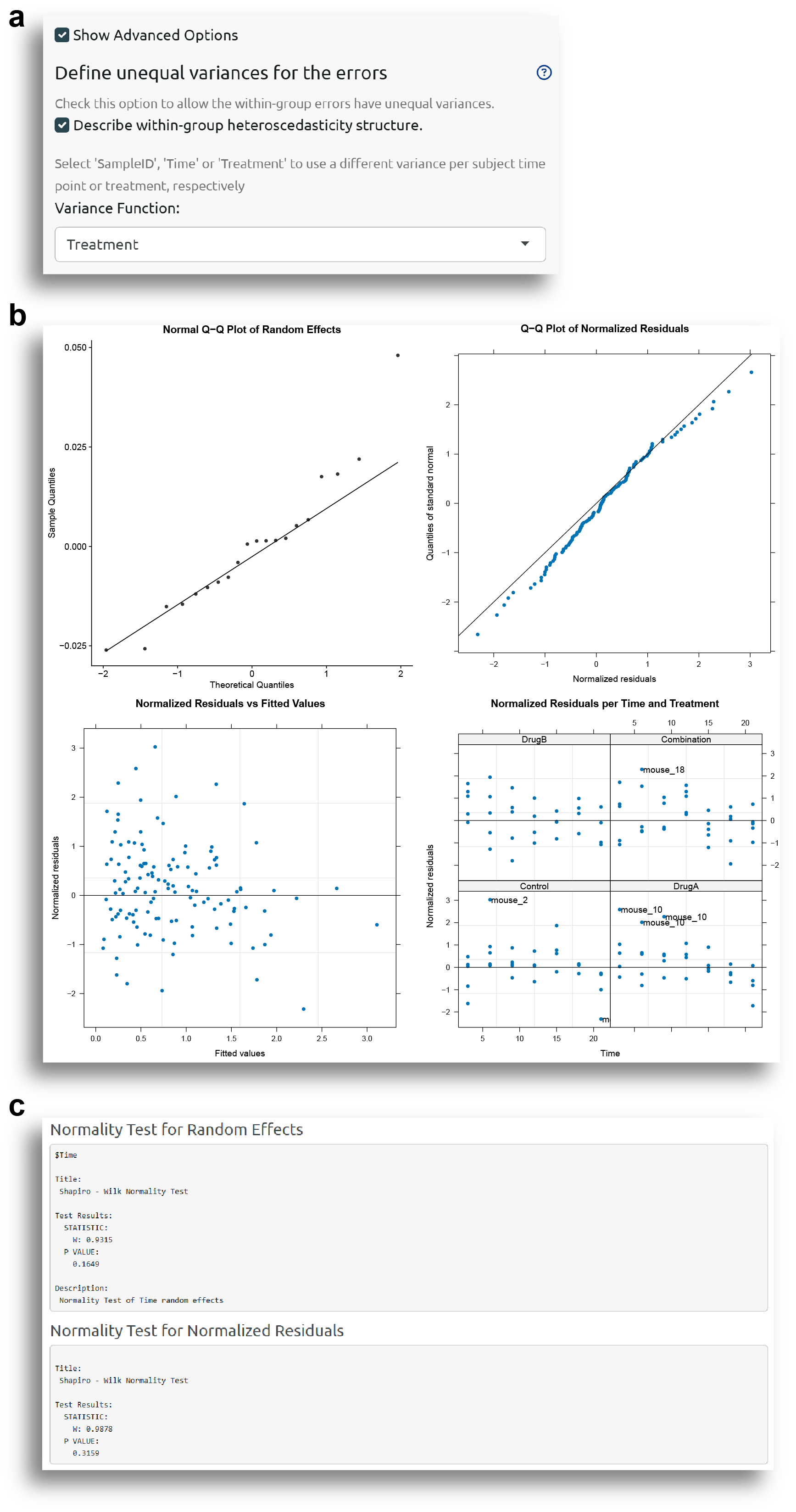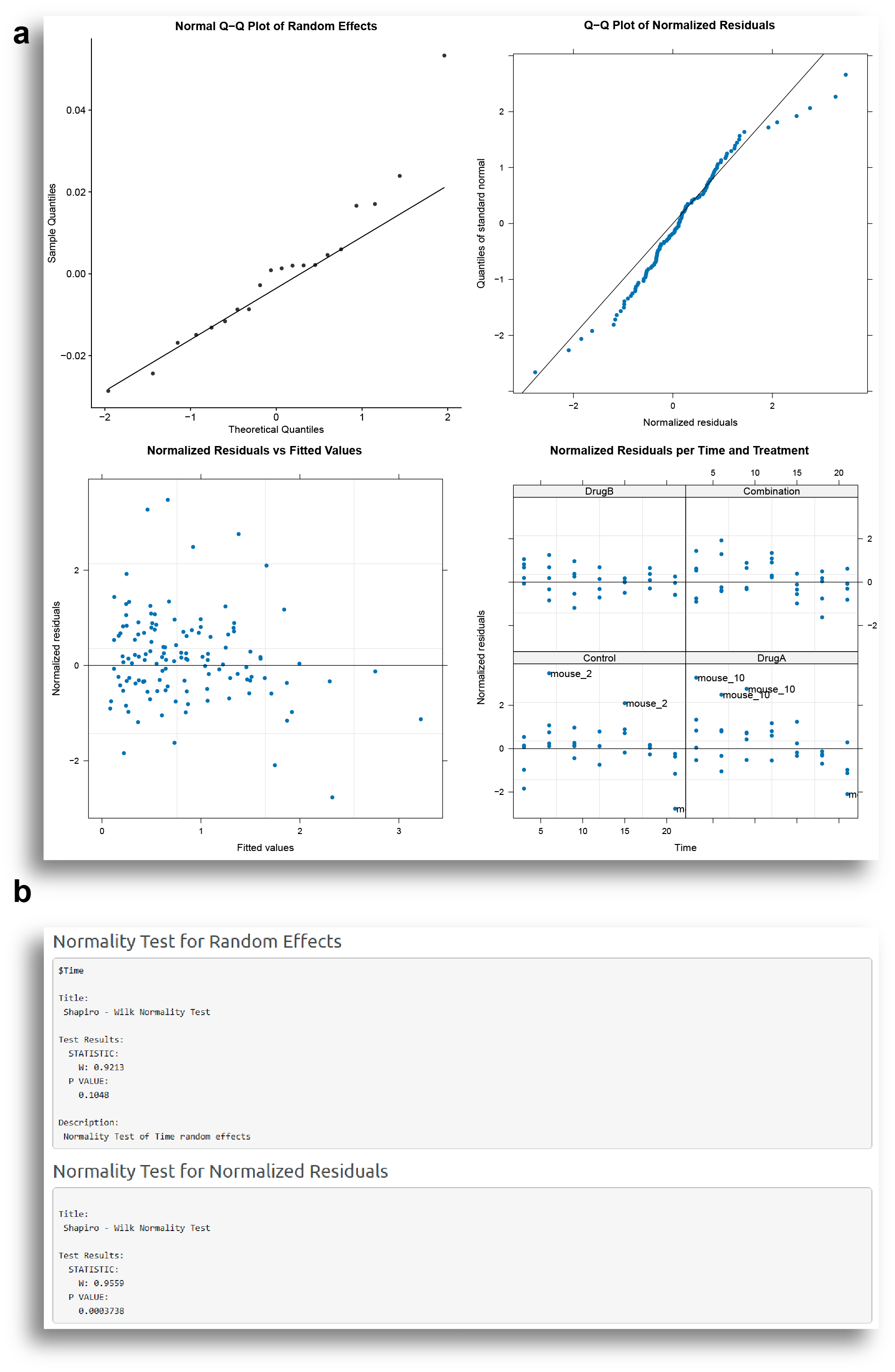 The model diagnostics output includes four plots to help evaluate the adequacy of the model. The two plots at the top of Fig. 4a show the Q-Q plot of the random effects and normalized residuals. Most points in these plots should fall along the diagonal line. The two plots at the bottom of Fig. 4a show scatter plots of the standardized residuals versus fitted values and standardized residuals per time and per treatment, which give information about variability of the residuals and possible outlier observations. The residuals in these plots should appear randomly distributed around the horizontal line, indicating homoscedasticity. Fig. 4b shows the output of Shapiro-Wilk normality tests for the random effects and the residuals. A non-significant p-value obtained by the Shapiro-Wilk normality indicates that there is no evidence to reject normalilty.