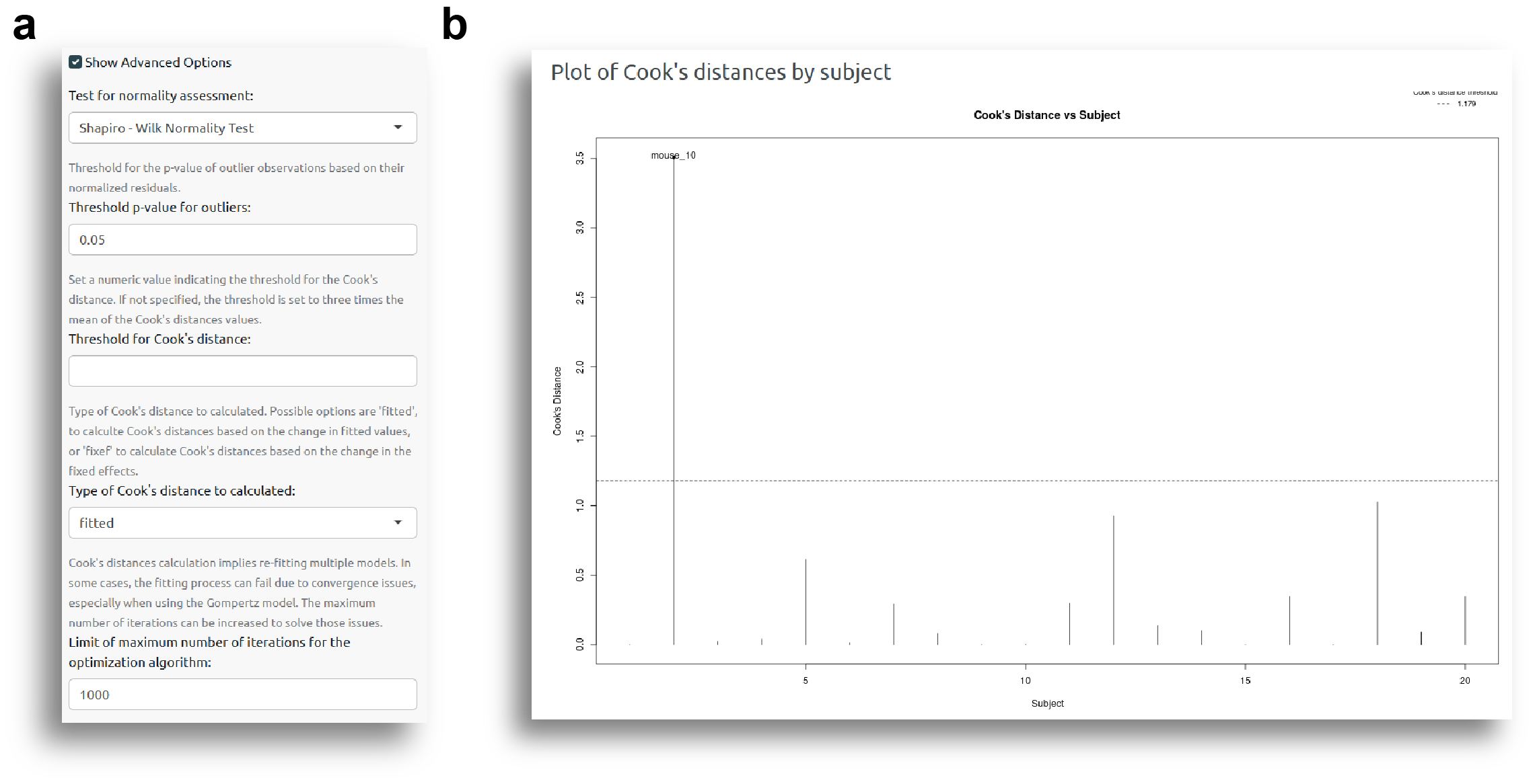 The Influential Diagnostics tab is useful to identify subjects that have a great impact in the model and that may warrant more careful analysis. To this end, SynergyLMM uses subject-specific Cook's distances.