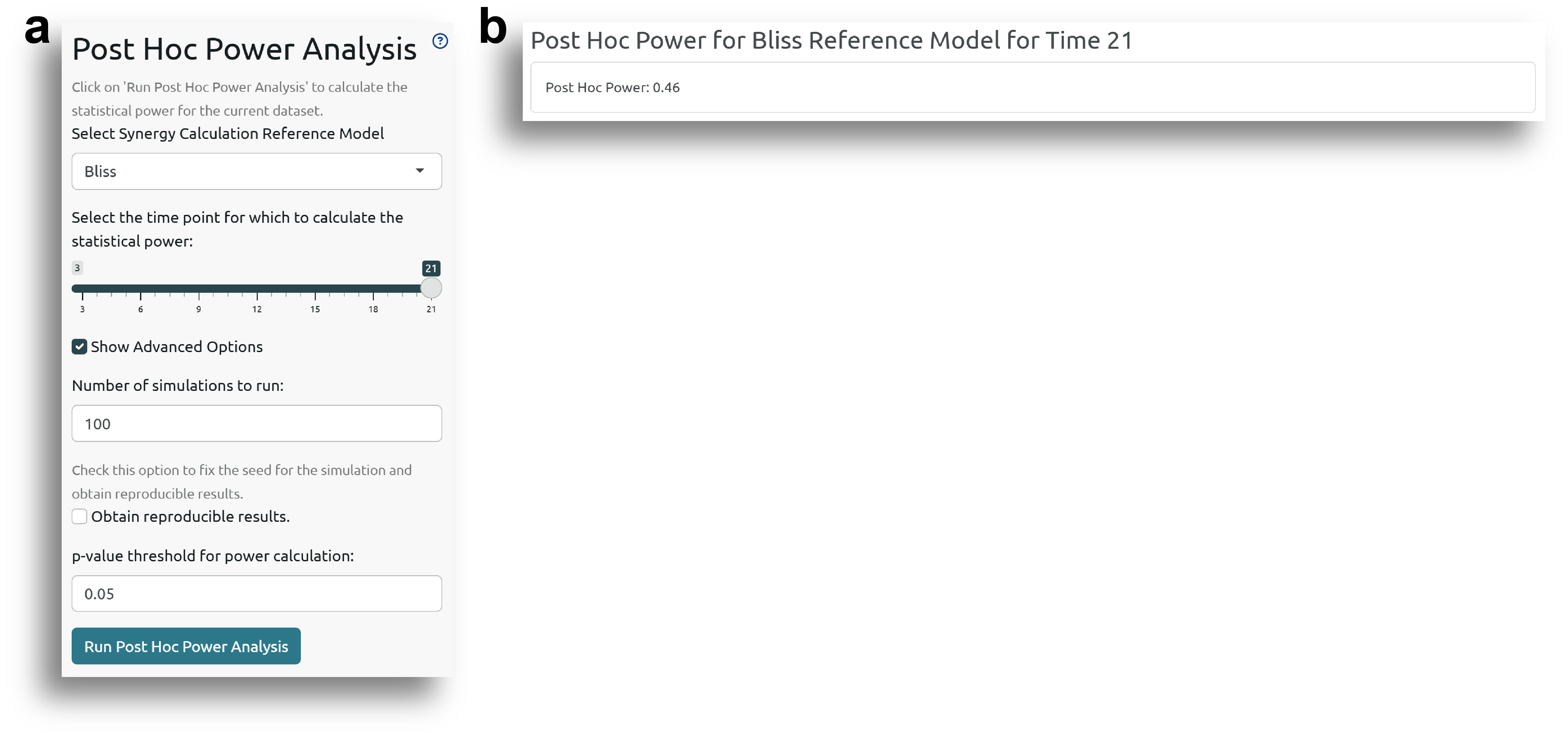 Fig. 8a shows the side panel for running the post hoc power analysis. The user can define the number of simulations to run, the p-value threshold for considering significance, and the time point for which to perform the analysis.
